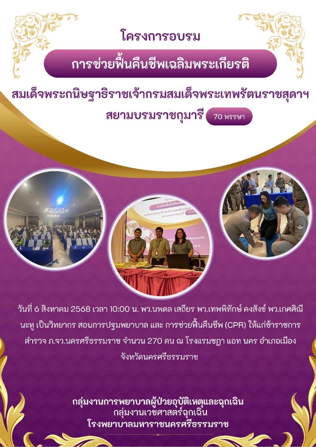 วันที่ 6 สิงหาคม 2568 พว.นพดล เสถียร, พว.เทพพิทักษ์ คงสังข์, พว.เกศศิณี นะหู เป็นวิทยากรสอนการปฐมพยาบาล และการช่วยฟื้นคืนชีพ ให้แก่ข้าราชการตำรวจ ภ.จว.นครศรีธรรมราช ที่โรงแรมชฎา แอท นคร อำเภอเมือง จังหวัดนครศรีธรรมราช