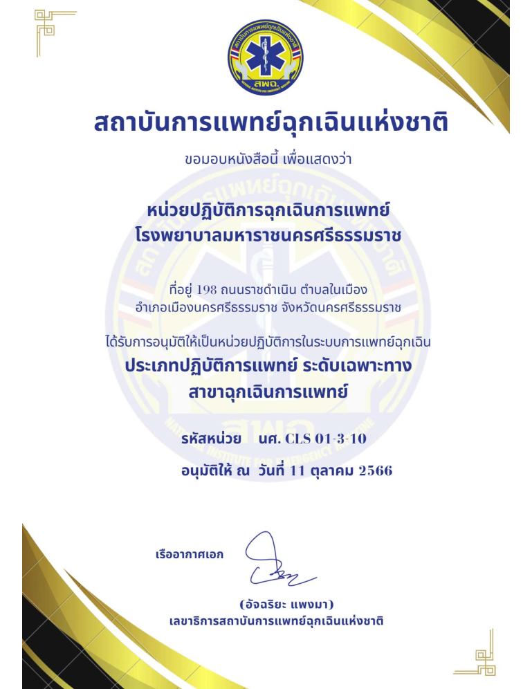 หนังสือรับรองมาตรฐานงานดูแลผู้ป่วยฉุกเฉินนอกโรงพยาบาล และรางวัลที่ได้รับ